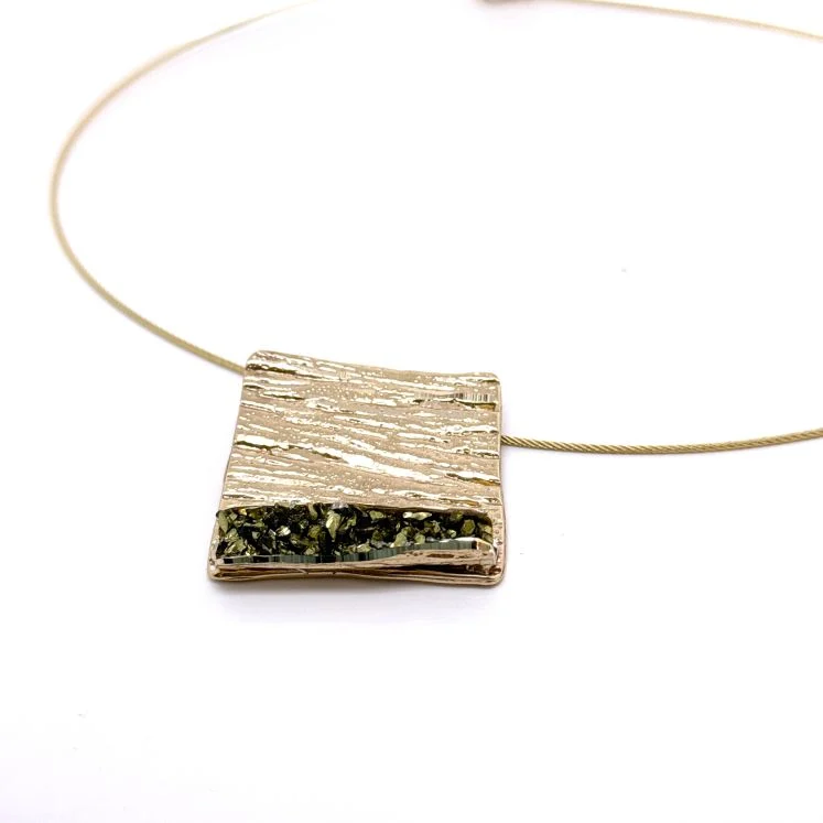 Κολιέ Primal Geometry K1009 από το εργαστήριο της Tina Kotsoni. Χειροποίητο κολιέ από ορείχαλκο με χρωματιστή πατίνα, ακατέργαστους κρύσταλλους και ασημένιο κούμπωμα 925. Δουλεμένα με την τεχνική του διαμανταρίσματος που προσδίδει στο μέταλλο την απόλυτη λάμψη.