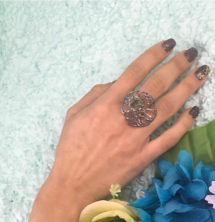 Δαχτυλίδι Fishnet D1043 από το εργαστήριο της Tina Kotsoni. Χειροποίητο δαχτυλίδι από ορείχαλκο ρυθμιζόμενου μεγέθους με χρωματιστή πατίνα, ακατέργαστους κρυστάλλους και γάμπα από ασήμι 925. Δουλεμένο με την τεχνική του διαμανταρίσματος που προσδίδει στο μέταλλο την απόλυτη λάμψη.