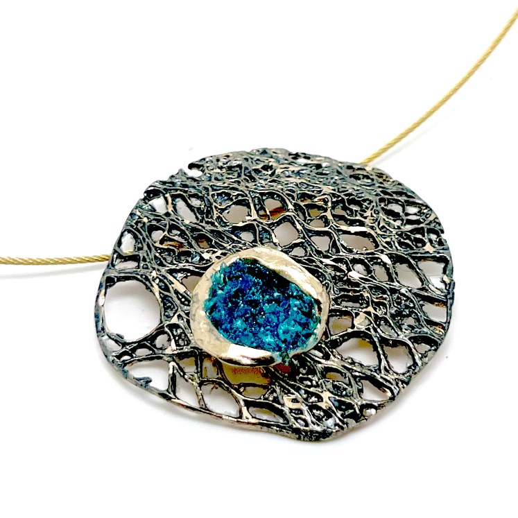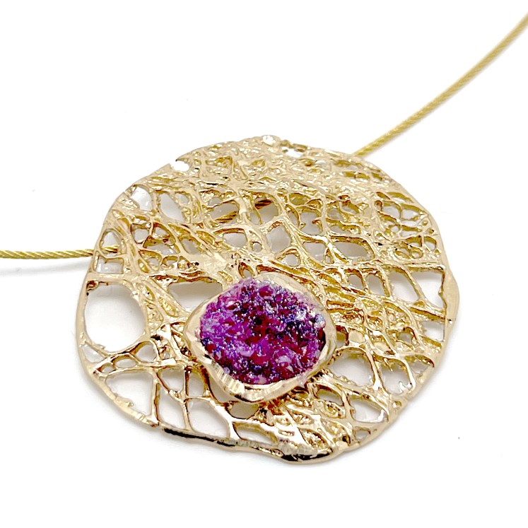 Κολιέ Fishnet K1043 από το εργαστήριο της Tina Kotsoni. Χειροποίητο κολιέ από ορείχαλκο με χρωματιστή πατίνα, ακατέργαστους κρύσταλλους με αλυσίδα από stainlees steel. Δουλεμένο με την τεχνική του διαμανταρίσματος που προσδίδει στο μέταλλο την απόλυτη λάμψη.
