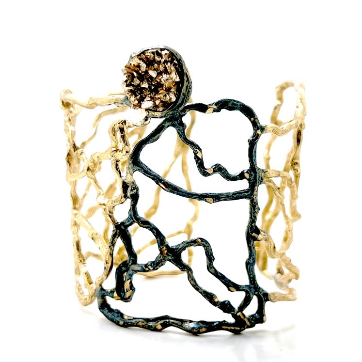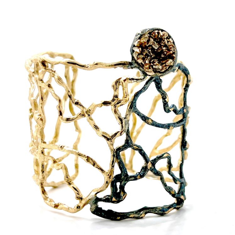 Βραχιόλι Frontiers B1070 Geode από το εργαστήριο της Tina Kotsoni. Χειροποίητο βραχιόλι από ορείχαλκο με χρωματιστή πατίνα και ακατέργαστους κρυστάλλους. Δουλεμένα με την τεχνική του διαμανταρίσματος που προσδίδει στο μέταλλο την απόλυτη λάμψη.
