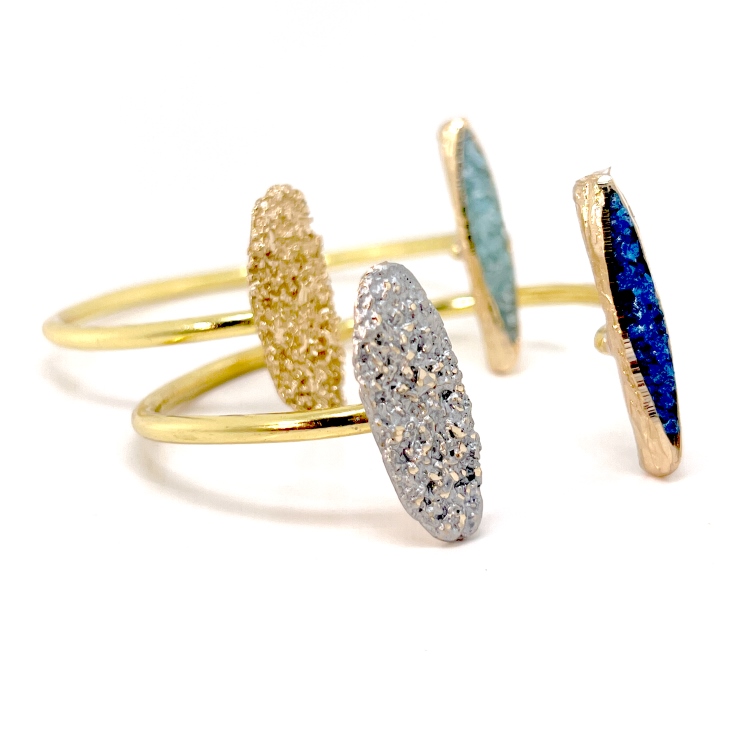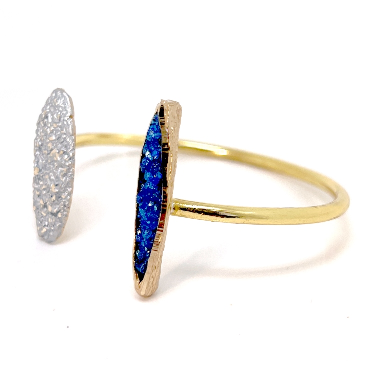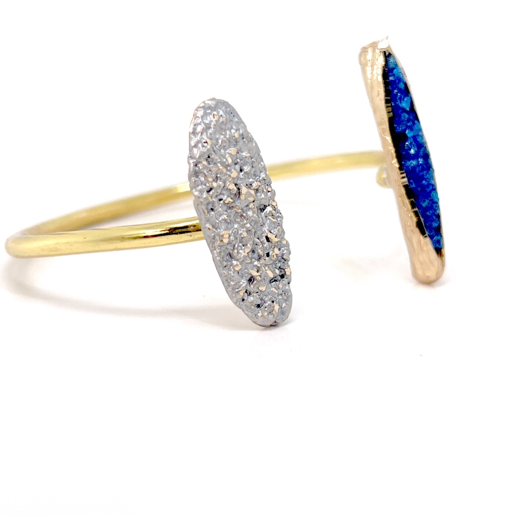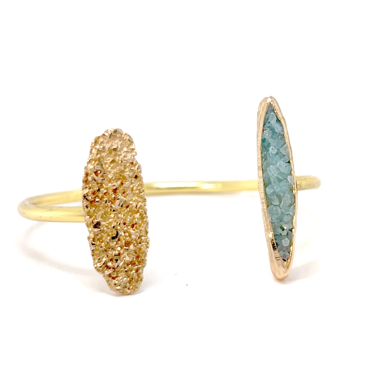 Βραχιόλι Sand B17 Geode από το εργαστήρι Tina Kotsoni. Χειροποίητο βραχιόλι από ορείχαλκο με χρωματιστή πατίνα και ακατέργαστους κρύσταλλους. Δουλεμένο με την τεχνική του διαμανταρίσματος που προσδίδει στο μέταλλο την απόλυτη λάμψη.
